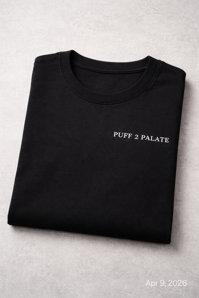 This premium unisex black tee features a custom woven neck label, a subtle mark of quality that speaks before you do. Soft, structured, and designed for comfort, this is more than a tee. It's the foundation of the Puff 2 Palate lifestyle collection.